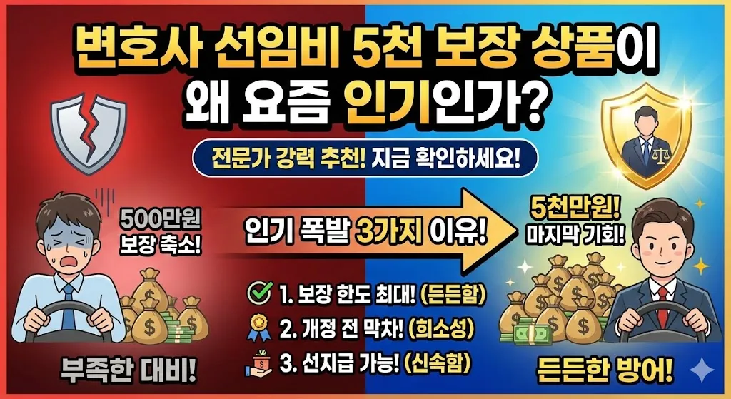 변호사선임비용 5천 보장 상품이 왜 요즘 인기인가에 대해 알아보겠습니다. 최근 운전자보험 시장에서 변호사선임비용 5천만원 보장 상품에 대한 관심이 급증하고 있습니다. 보장 한도 축소와 자부담 도입이 진행되는 상황에서 왜 5천 보장 상품이 인기를 끌고 있는지 궁금해하는 분들이 많습니다. 이 글에서는 5천 보장 상품 인기의 이유, 가입 시 장점, 지금 가입해야 하는 이유 등을 상세히 정리했습니다.